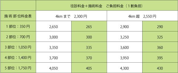マッサージ料金と往療料の早見表